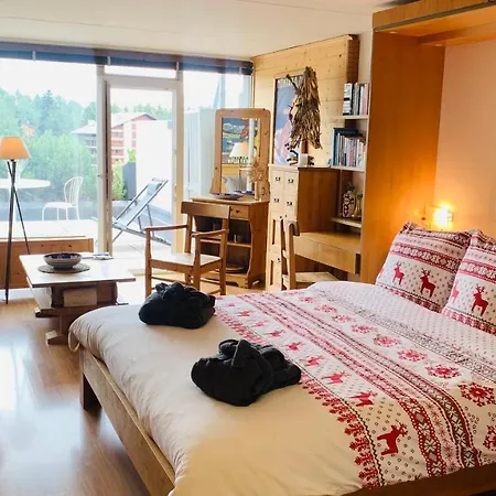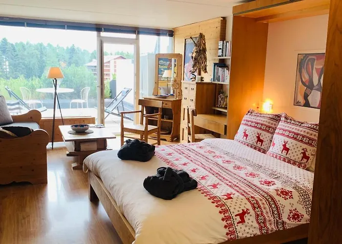 Etrier Lägenhet Crans-Montana med 1 sovrum, som ligger i Crans-Montana cirka 15 minuter med bil från Happyland nojespark, ståtar med inomhuspool. Den här 40 m² stora lägenheten har en terrass och en privat pool för gästernas ultimata avkoppling.
